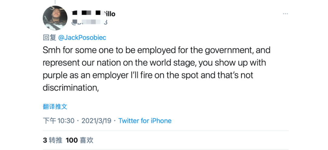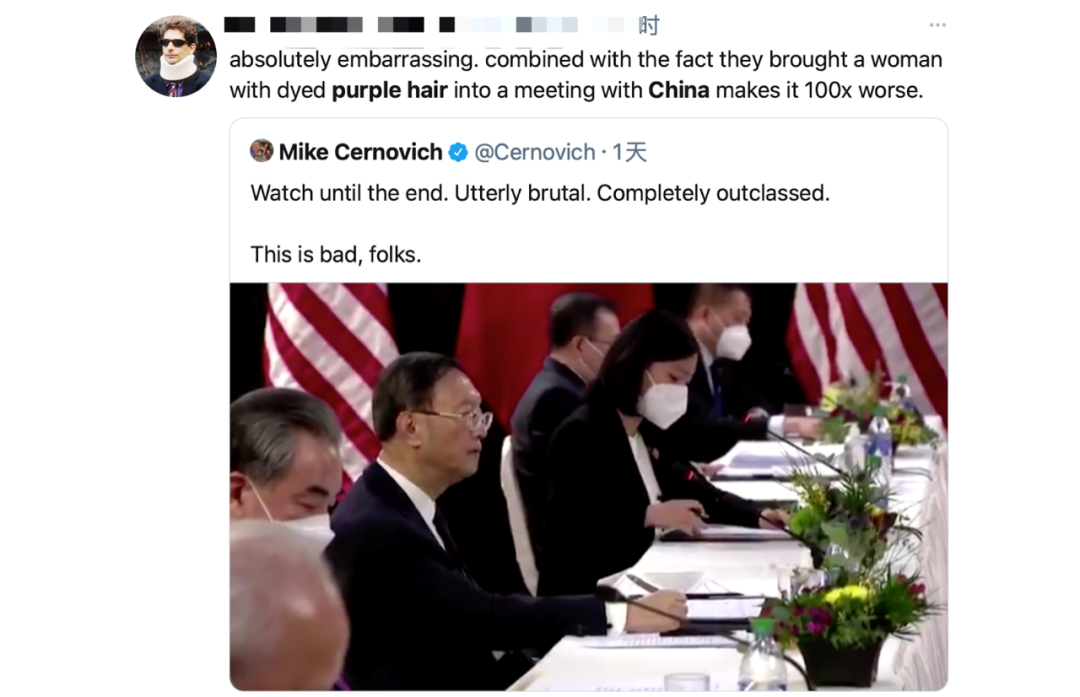 值得注意的是,当中国网友被中方翻译人员的表现圈粉时,不少美国网友,却对美方代表团中一位染紫色头发的翻译感到不满。