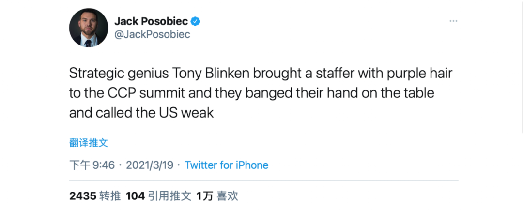 美国记者杰克·波索比克(Jack·Posobiec)发推文表示,美国国务卿布林肯带着一头紫色头发的工作人员参加中美高层会议,会被认定为美方“软弱”。波索比克嘲讽布林肯真是个“战略天才”,该推文已经被转载2400余次,获得了1万枚点赞。
