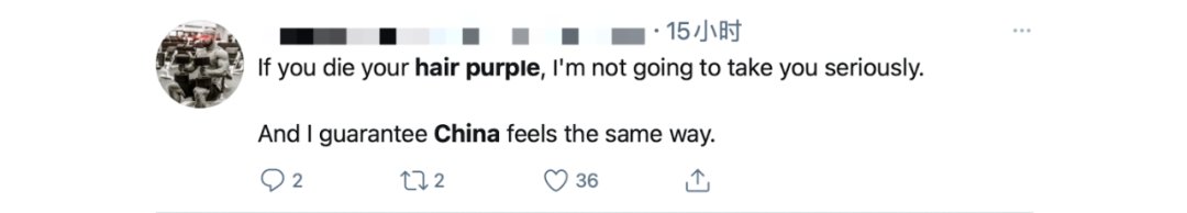 还有网友表示,“紫色头发本身不是错,而是全世界都已经厌倦了美国的哗众取宠和‘战争贩子’的形象。美国已经失去了所有的信誉。比赛结束了,你输了。”