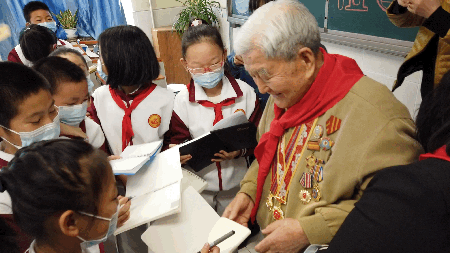 班会结束了,可孩子们还恋恋不舍不肯离去,手里抓着崭新的笔记本和钢笔怯生生地问杨庆久老人:爷爷,您能给我签名吗?得到肯定的回答后,孩子们立刻围拢在杨庆久老人身边,轻轻地摸着他胸前的纪念奖章,静静地等待老人家一笔一画地签名。