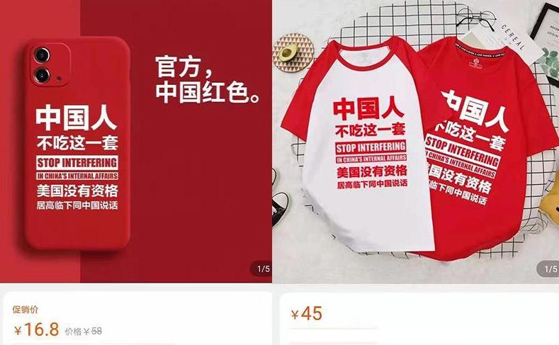 △某些电商平台上,各商家纷纷上架“美国没有资格居高临下同中国说话,中国人不吃这一套”相关文化衫、手机壳