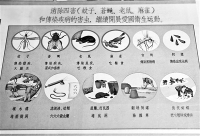什么是“四害”?在第31版“发展人民保健事业”中,提出消除四害(蚊子、苍蝇、老鼠、麻雀)和传染疾病的害虫,每一类虫害都配以形象的插画。