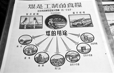 以煤炭版面为例,五年内国家要建成115个大煤矿,并实施采煤机械化。竖井煤矿和露天煤矿是何模样?两张插画分别给出了答案;版面中还介绍煤的用途包括燃料、发电、炼铁、炼汽油、生活用煤等,每个应用领域都配有插画。