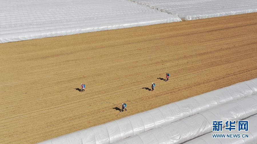 3月21日,河北省石家庄市栾城区西营乡后小梅村鲜姜种植户在农田里劳作(无人机照片)。