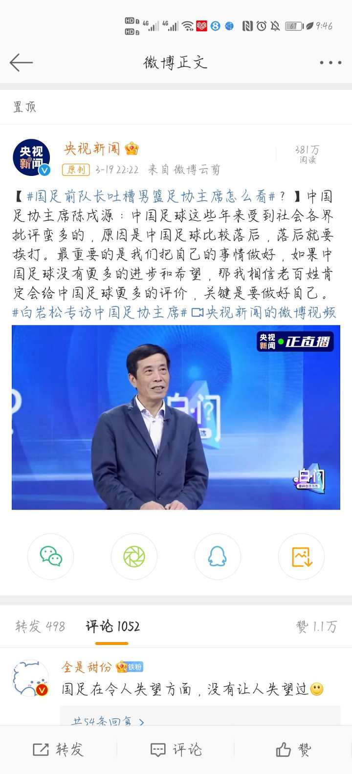 3月19日,白岩松在专访中国足球协会主席陈戌源时,也就范志毅吐槽篮球一事提问。