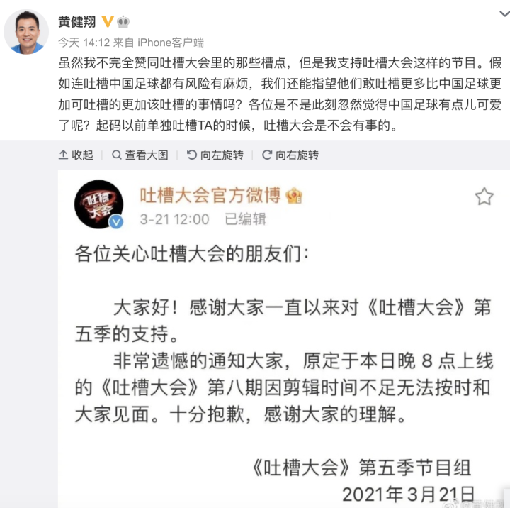 3月21日,吐槽大会官方微博发布公告,宣布原定于本日晚 8 点上线的《吐槽大会》第八期(也就是体育专场下集),因剪辑时间不足无法按时和大家见面。