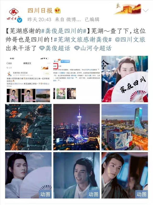 原来,在这段视频“出圈”后,芜湖文旅迅速反应,发布微博“感谢龚俊”,还邀请龚俊去芜湖。随后,四川文旅马上“抢人”:这明明是我们的四川娃,咋个又有人跟我们抢!可能是有了跟西藏、新疆、云南、贵州抢丁真的经验,四川日报直接po出百科证据,证明龚俊是四川成都人无疑。四川从引起误会的歌“呜呼”出发,表示,“不就是湖吗,我们也有——泸沽湖!”紧接着又跟芜湖PK美食……双方你来我往,好不热闹,也为两地刷足了关注度。