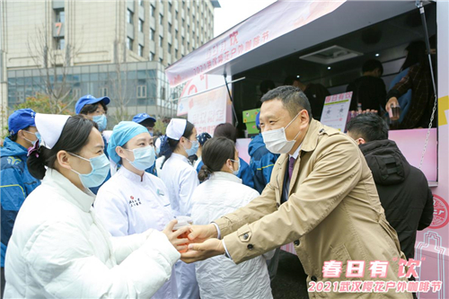 3月19日上午,武汉大学人民医院东院区迎来了两个可爱的大家伙——盛装打扮的东风途逸樱花咖啡车。伴随着浓郁的咖啡香气,近百名武汉软件工程职业学院的大学生志愿者为医护人员送上了热腾腾的樱花咖啡和饱含诚意的手写明信片。自此,2021武汉樱花户外咖啡节温馨启幕。