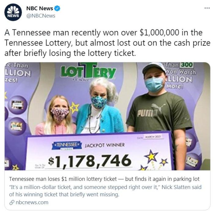 中新网3月22日电 据美国全国广播公司(NBC)报道,近日,美国田纳西州一名男子购买彩票并中了100多万美元,但之后,他在陪家人购物时险些丢失了彩票,幸最终在一家曾到过的商店停车场将彩票找回。