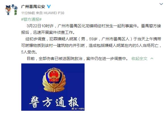 经初步调查,犯罪嫌疑人胡某(男,59岁,广州市番禺区人)于当天上午携带可燃爆物质到该村一建筑物内并引燃,造成包括嫌疑人胡某在内的5人当场死亡,5人受伤。