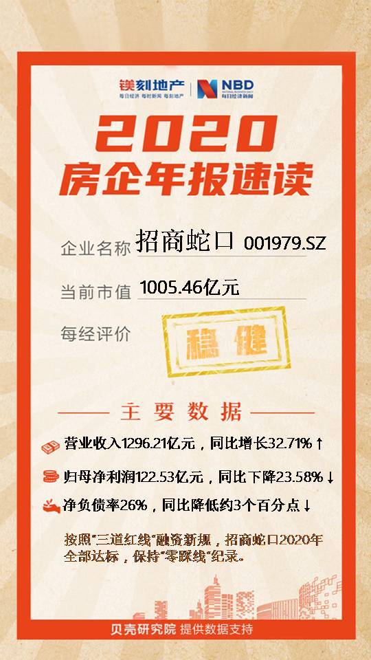 据贝壳研究院统计,依照“三道红线”融资新规,招商蛇口剔除预收款后的资产负债率为58%,较上年同期增长约2个百分仍处于达标标准之内;净负债率为26%,较2019年同期较低负债水平的基础上继续降低约3个百分点;现金短债比为1.62,较上年同期提升约0.25。由此,招商蛇口2020年“三道红线”全部达标,保持“零踩线”纪录。