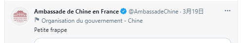 一时间,一众“小丑”们愈发兴奋。邦达兹不仅在推特为之叫好,还阴阳怪气地@中国大使馆称“给你和你的妖魔们一个大大的吻”。随后,我国大使馆于19日发了一条两个单词的推文——“petite frappe”,字面意思为“无力的回击”,法国俚语中有“小流氓、小混混”之意。岂料,这一下击碎了某些人的玻璃心。法国媒体和一些议员据此大做文章,攻击中国大使馆和卢沙野大使“话风粗野”“战狼外交”,侮辱了法国学者、不尊重“言论自由”等等。