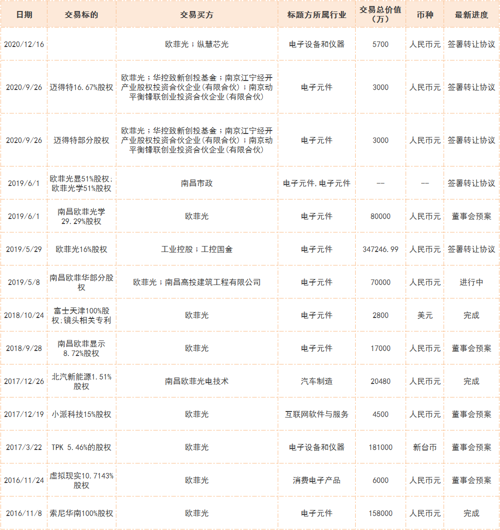 比如富士胶片光电(天津)有限公司,从2018年10月24日董事会预案,到同年12月28日完成,欧菲光仅用时两个月就完成对其100%股权收购的所有流程。彼时交易价值2800万美元,并购的目的为横向整合。
