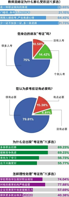 我就曾经跟风考了教师资格证,当时身边的人都在考。我觉得多考一些证书是可以的,但今后真不一定用得到。我觉得大家热衷于考证跟现在职场压力大有关系,总怕被淘汰不好找工作,抱着“技多不压身”的心态去考,给自己留一条后路。我觉得“考证热”有利有弊,但总归不能影响正常工作、学习。