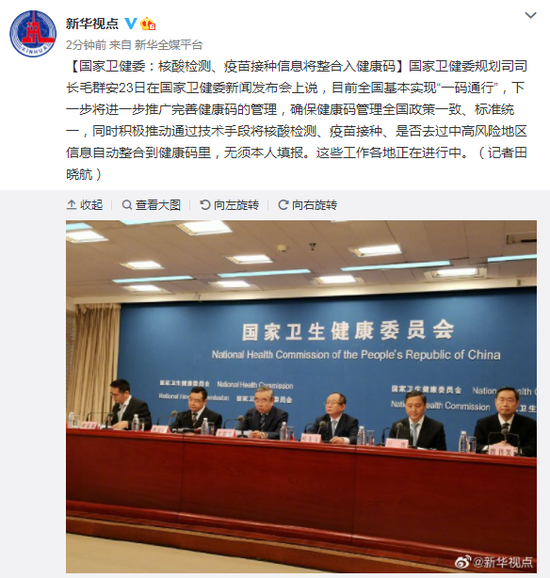 原标题:国家卫健委:核酸检测、疫苗接种信息将整合入健康码