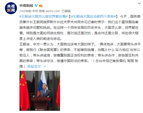 【王毅说大国应当做四个表率】 今天,国务委员兼外长王毅同俄罗斯外长拉夫罗夫共同会见记者时表示:我们这个星球面临着越来越多问题和挑战。在这样一个百年变局的历史关头,大国怎么做,世界都在看。特别是大国如何彼此相处,是对话还是对抗,是合作还是分裂,将在很大程度上决定人类的前途与命运。