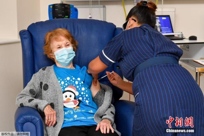 资料图:2020年12月8日,英国开始接种新冠疫苗。图为医护人员为90岁女子玛格丽特·基南接种疫苗。