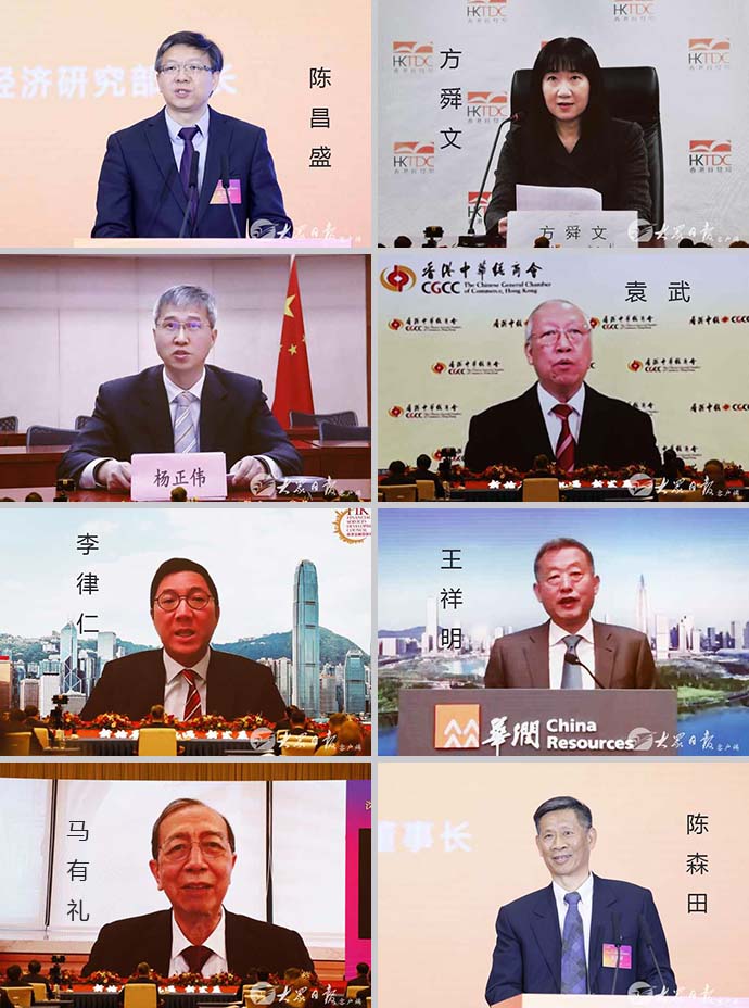 会上,国务院发展研究中心宏观经济研究部部长陈昌盛、商务部国际经贸关系司副司长杨正伟围绕融入新发展格局、抓住RCEP发展机遇等进行深入阐述和政策解读。香港贸发局总裁方舜文、香港金融发展局主席李律仁、香港中华总商会会长袁武、澳门中华总商会会长马有礼、华润集团董事长王祥明、台湾乾隆国际控股有限公司董事长陈森田,聚焦服务贸易、金融、产业等领域,为进一步深化山东与港澳台合作建言献策。