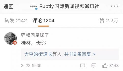 在Ruptly的评论区,一条网友的解读,获得三千多个点赞,登上评论首位:“桂林,贵邻。”