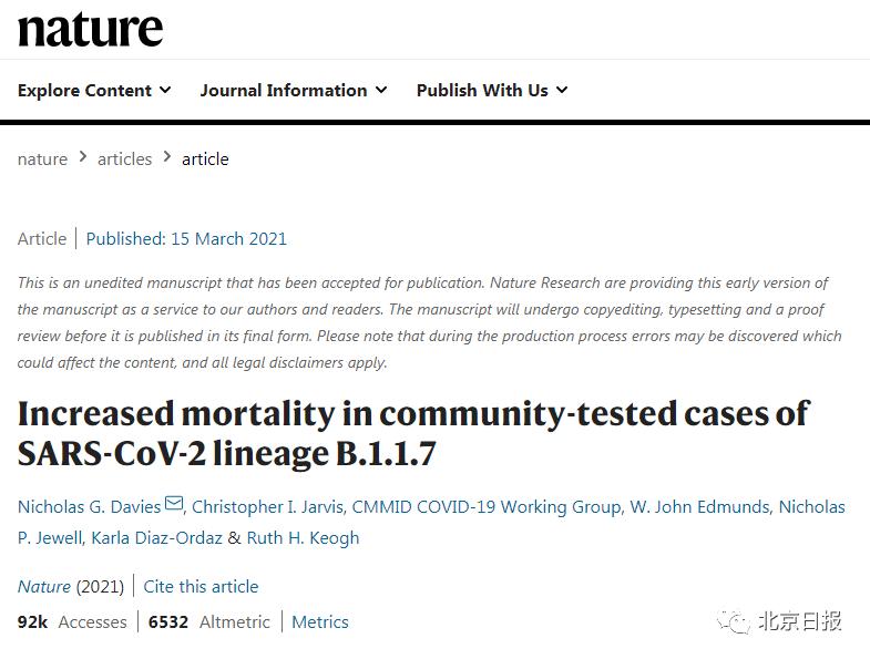 3月15日,国际著名期刊Nature上发表了一篇名为《Increased mortality in community-tested cases of SARS-CoV-2 lineage B.1.1.7》的研究文章。