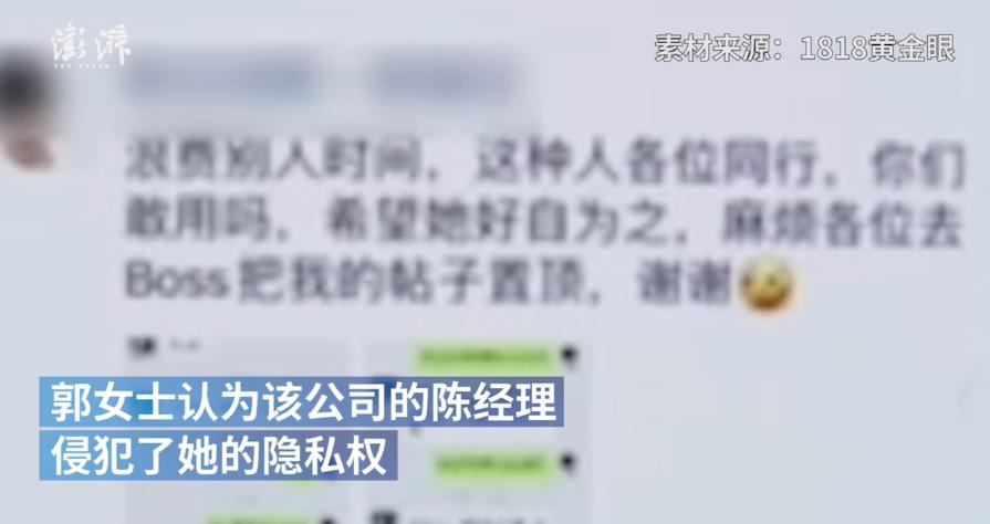 浙江杭州。郭女士找了份工作,规定入职前一天她说临时有事放弃了。据1818黄金眼,人事经理责备她“一点诚信都没有”,并将其部分简历发朋友圈,郭女士感觉隐私被侵犯。