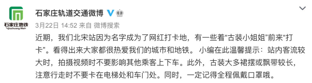 但3月22日,@石家庄轨道交通微博 发布提醒:
