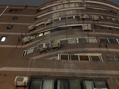 大楼外墙瓷砖掉落。顺着保安所指的方向,澎湃新闻记者看到,外墙瓷砖脱落处位于5楼窗户之上,脱落处约有6扇窗那么宽,窗口下方一空调外机已被砸歪。
