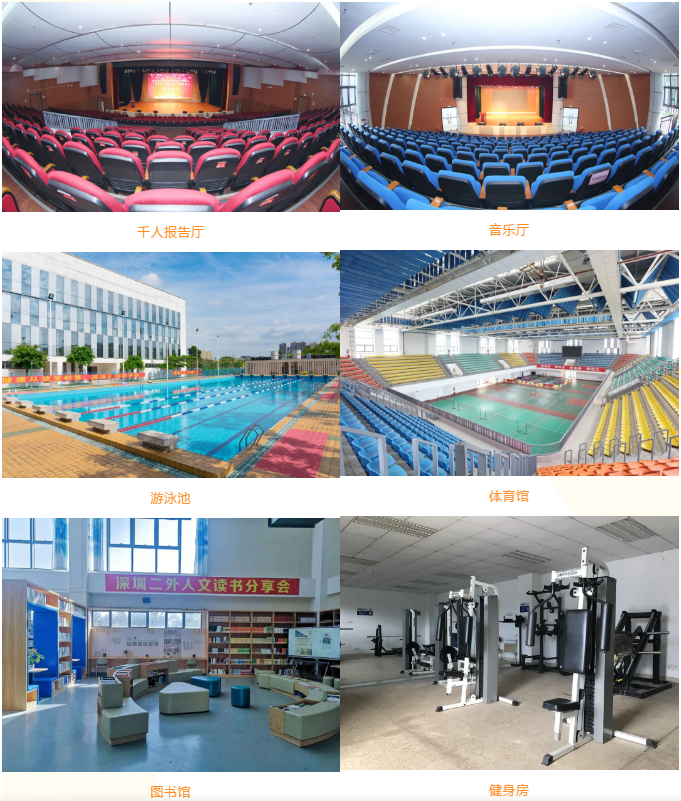 深圳第二外国语学校占地11.9万平米,有着优越的空间优势和设施设备优势,有标准的足球场、跑道和游泳池,有6000多平米设施齐全的体育馆、4层共3000多平米的图书馆、120多平米的航空模拟驾驶室、3间共500多平米的体能训练室和健身室、120平方米的创客实践基地,3间共300多平米的通用技术室、80多平米的车模和海模训练室、8间计算机(语音)室、130平米的心理辅导室、2548平米的多功能厅等,是全市特色功能设施齐全的高中之一。