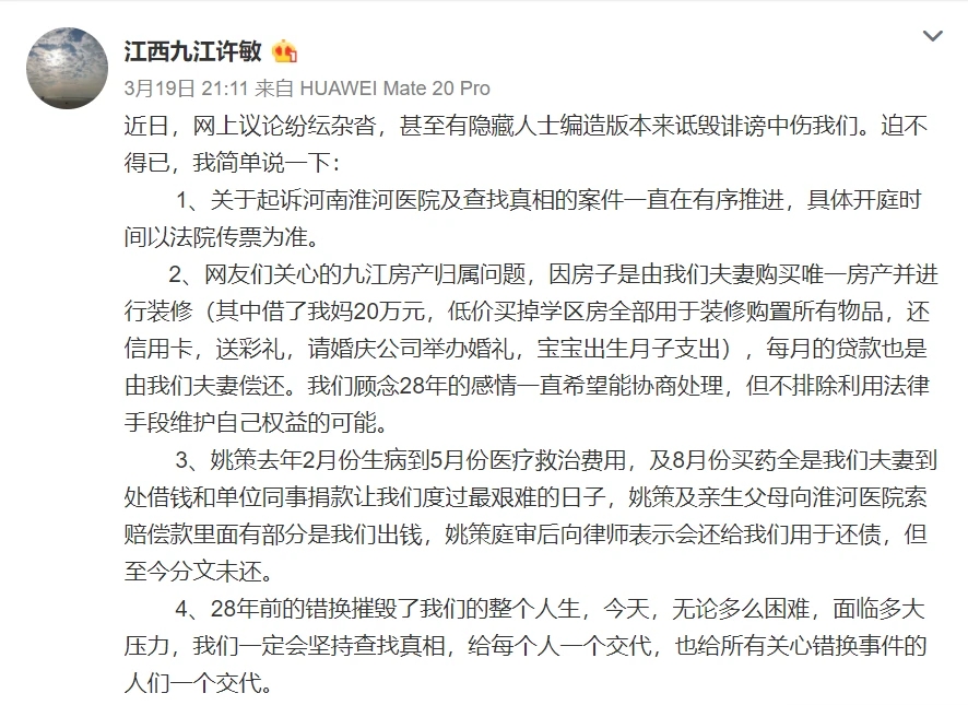 3月19日,姚策养母许敏在微博上回应房产归属和救治费用问题,提出了4个疑点。