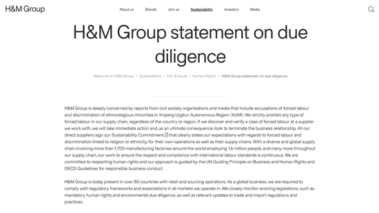中国青年报记者查询发现,这份声明写道:H&M集团对来自民间社会组织的报告和媒体的报道深表关注,其中包括对新疆维吾尔自治区少数民族强迫劳动和宗教歧视的指控。(H&M Group is deeply concerned by reports from civil society organisations and media that include accusations of forced labour and discrimination of ethnoreligious minorities in Xinjiang Uyghur Autonomous Region (XUAR)。)