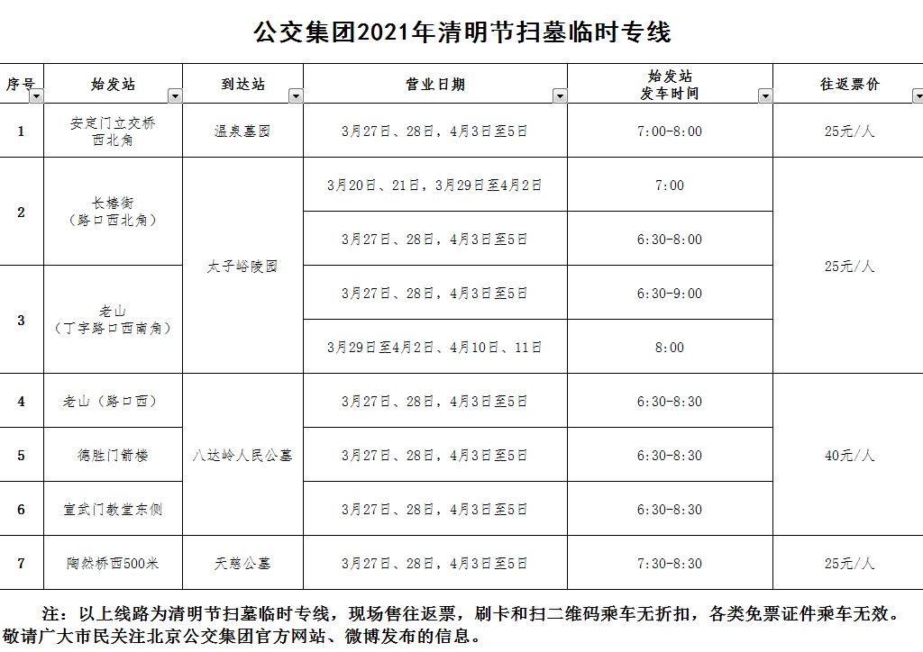 1.安定门立交桥西北角-温泉公墓,营业日期:3月27日、28日、4月3日至5日,发车时间7:00-8:00,往返票价:25元/人。