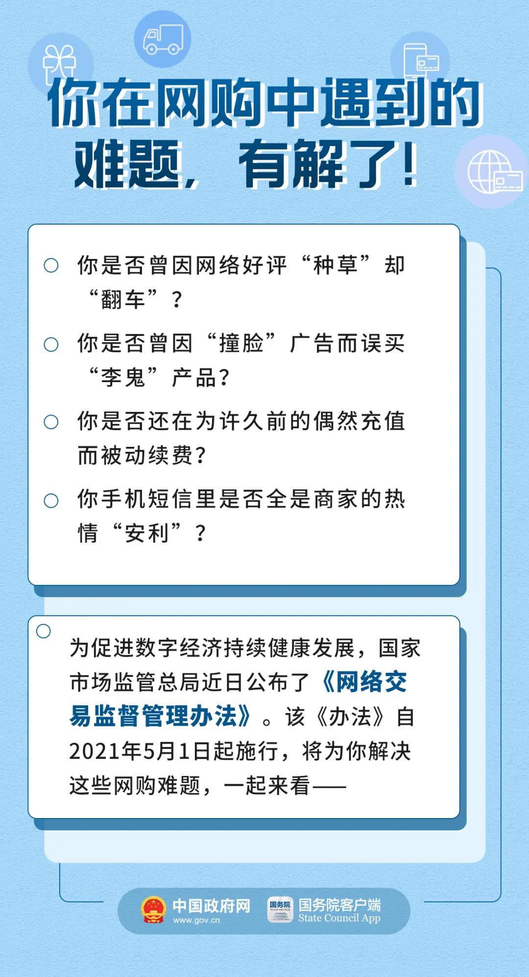央视网消息:为促进数字经济持续健康发展,国家市场监管总局近日公布了《网络交易监督管理办法》。该《办法》自2021年5月1日起施行,将为您解决这些网购难题,中国政府网公众号刊登文章,一起来看看吧。