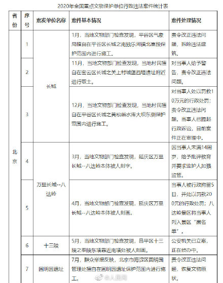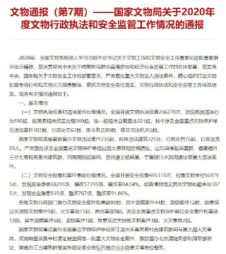 3月24日,国家文物局通报,2020年全国开展文物执法巡查发现各类违法行为590起,包括2020年7月群众举报反映的北京市海淀区圆明园管理处擅自在圆明园遗址保护范围内进行施工案件,已责令相关单位改正违法问题,恢复文物原状。