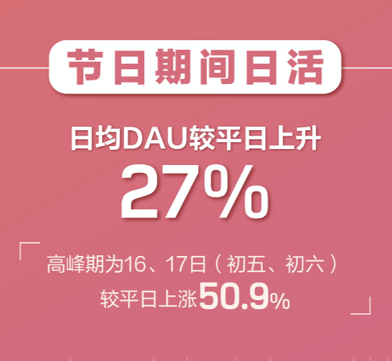 2月20日,百合婚恋发布了2021年春节假期大数据:在2月11日(除夕)至17日(初六)期间,百合婚恋app日均新增用户数较节前增长81%;日均(DAU)较平日上升27%。