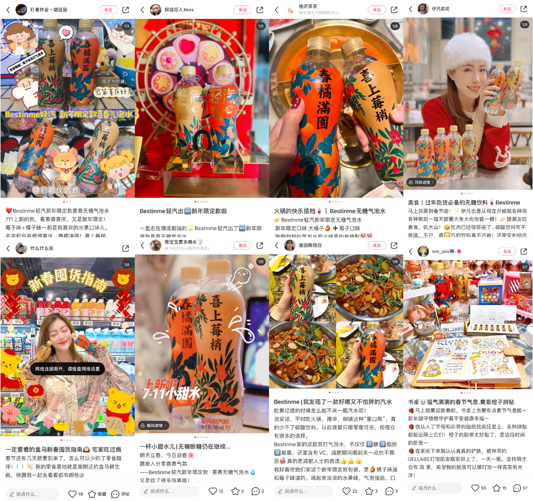 不同的是,今年在很多家庭的年夜饭餐桌上,以往司空见惯的高糖分的可乐、果汁类饮料更多被低糖饮料代替。顺应过年理念和消费习惯的变化,消费者在饮食和送礼的场景上越来越追求品质和健康。据悉,截至二月中旬,Bestinme轻汽“喜春”系列销量就已超100万瓶,成绩喜人。