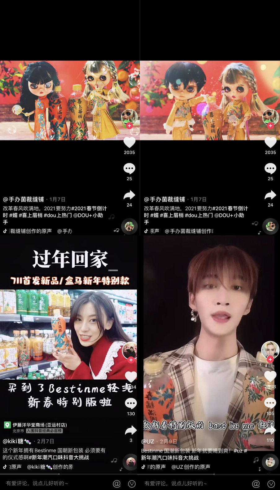 在小红书平台,有不少用户发布种草笔记安利“喜春”系列。“减肥人士首选”、“高卡日完美搭档”、 “新年限定款国潮包装打动了本颜控”、“火锅撸串重口局的新选择”……国潮包装、解腻口感及健康成分,使得“喜春”系列收获了不少好口碑。更有抖音UP主以瓶身设计为灵感了,创作了两套令人惊艳的“国风服饰轻汽娃娃”,引发网友围观。