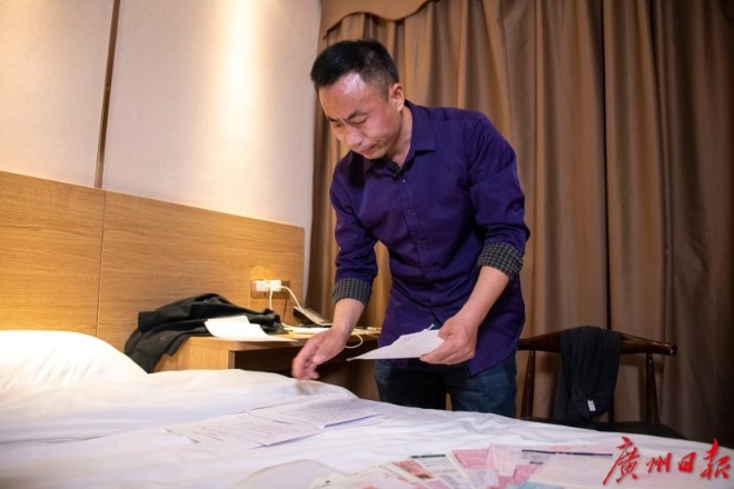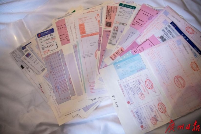3月24日,赶来广州准备参加二审庭审的申军良,在酒店里向记者展示了厚厚一叠寻子支出单据,“这里面包括了妻子就诊、自己乘坐火车留下的车票和寻子路途中的各种花费票据材料。”