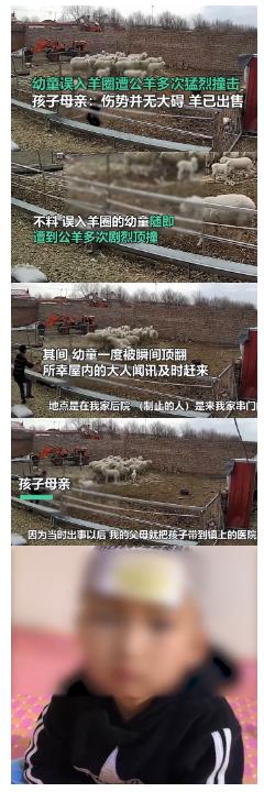 3月21日,内蒙古通辽,科左中旗单身妈妈上班时留下孩子在父母家,幼童误入羊圈被公羊剧烈顶撞5次,瞬间顶翻孩子。当孩子被抱着救起时候公羊还不放过。孩子额头伤口已缝合。善良的母亲未杀羊只是卖了。单亲妈妈懊恼不已:以后肯定不会了。