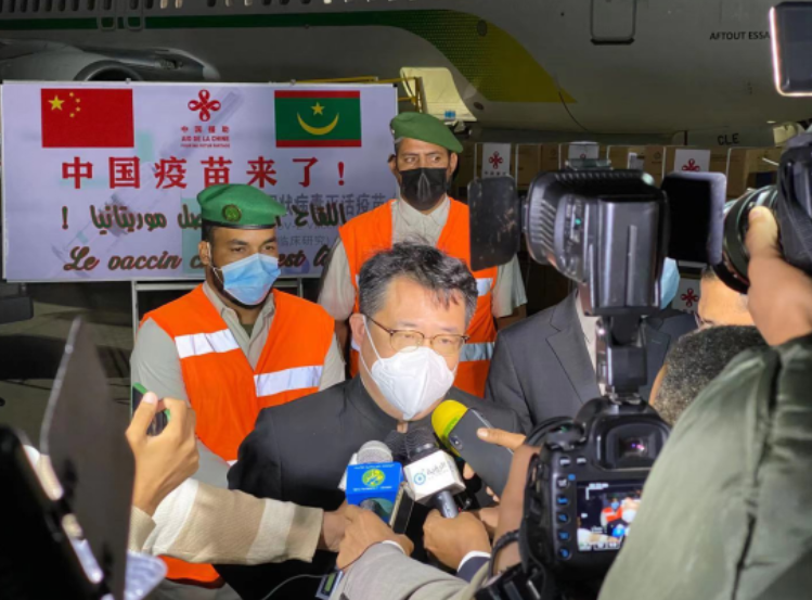 当地时间3月24日,毛里塔尼亚收到中国捐赠的首批国药新冠疫苗及13部呼吸机。当天凌晨,运送该批物资的飞机抵达毛塔首都努瓦克肖特国际机场。中国驻毛塔使馆临时代办王健、毛塔卫生部长纳迪鲁·哈迈德等人出席了在机场举办的捐赠仪式。