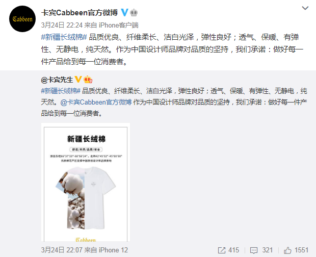 其中,安踏体育官方微博24日发文称,“我们一直采购和使用中国棉产区出产的棉花,包括新疆棉,在未来也将继续采购和使用中国棉。”