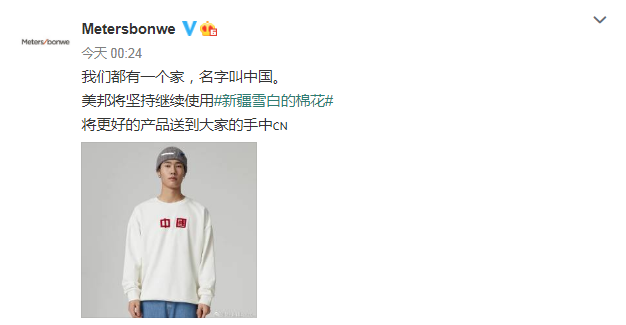 鸿星尔克官方微博24日官方微博发文称,支持中国造,力挺新疆棉。“鸿星尔克产品始终坚持使用中国棉,每年使用数千吨新疆棉。”