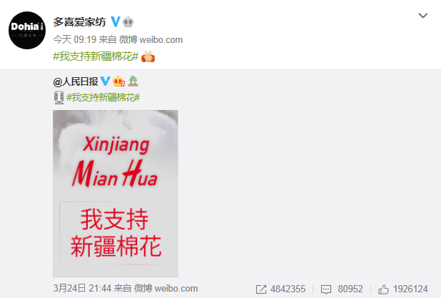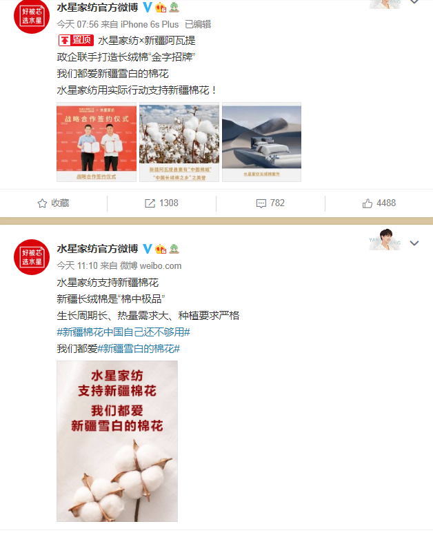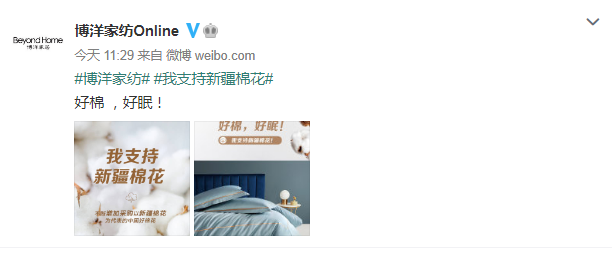 家纺品牌水星家纺称,水星家纺和新疆阿瓦提,政企联手打造长绒棉“金字招牌”,用实际行动支持新疆棉花。此外,罗莱家纺、博洋家纺和洁玉毛巾也发声支持新疆棉。
