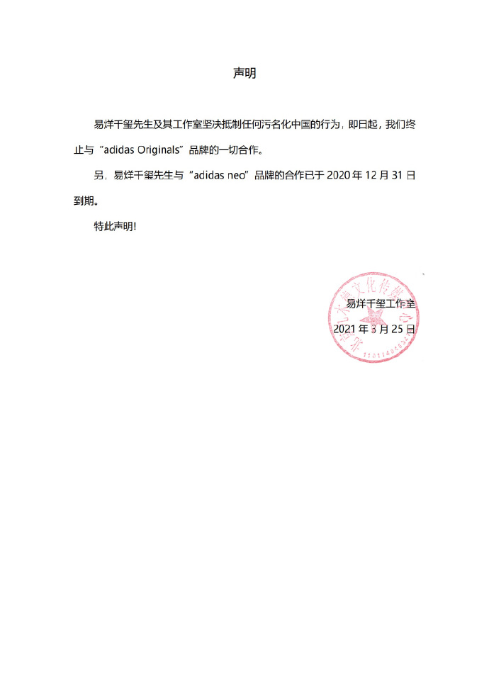 新京报快讯 25日,杨幂工作室、易烊千玺工作室、迪丽热巴工作室均发布声明,表示终止与阿迪达斯品牌合作。