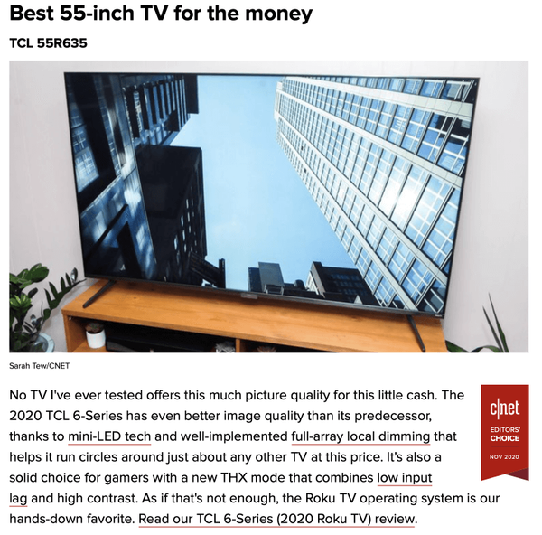 据美国权威测评网站Reviewed.com表示:“TCL在海外推出的Mini LED电视TCL 6系列,带来比前代产品更好的对比度控制,还以一半价格实现其他产品同等硬件性能,性价比高非常值得购买。”