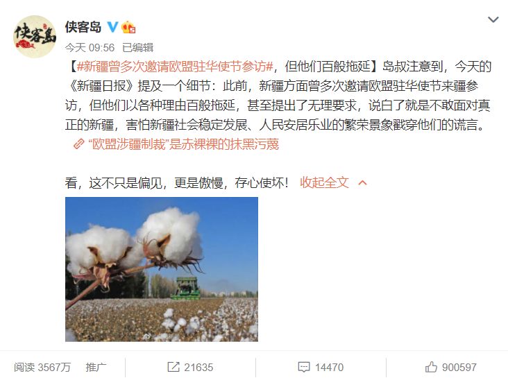 今天,新疆方面发布声明说,曾反复邀请欧盟驻华使节来新疆实地看一看,亲自看看有没有“强迫劳动”,可对方百般推脱、就是不来。中国倒是早就邀请了许多穆斯林国家大使到新疆访问,看过的人自然知道新疆根本不存在什么“强迫劳动”。