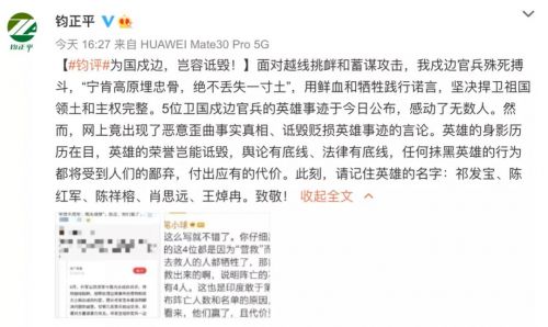 评论指出,面对越线挑衅和蓄谋攻击,我戍边官兵殊死搏斗,“宁肯高原埋忠骨,绝不丢失一寸土”,用鲜血和牺牲践行诺言,坚决扞卫祖国领土和主权完整。5位卫国戍边官兵的英雄事迹于今日公布,感动了无数人。然而,网上竟出现了恶意歪曲事实真相、诋毁贬损英雄事迹的言论。