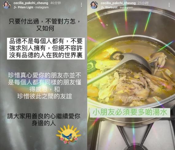3月25日,张柏芝在个人社交平台发布新动态。先是两段张柏芝亲自给孩子们用鸡汤煲粥的视频,张柏芝还在视频中配文,称小朋友一定要多喝汤水。