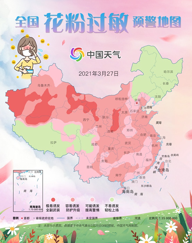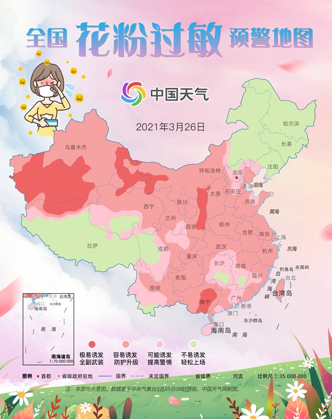 据中国天气气象分析师石妍介绍,目前我国大部地区都处在回暖期,尤其是中东部回暖明显。气温上升,应季花卉集体绽放,因此花粉浓度居高不下。