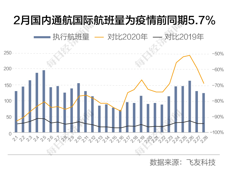 受海外疫情及出入境政策限制,2月中国通航国际航班量仍不容乐观,环比上月(1月)降低21.4%,整体相当于疫情前同期约5.7%的水平。