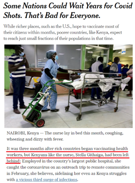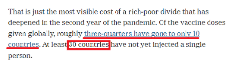 《纽约时报》日前发文指出,在全球接种的新冠疫苗中,有大约四分之三流向10个西方国家,而全球至少有30个国家尚无一人接种过疫苗。